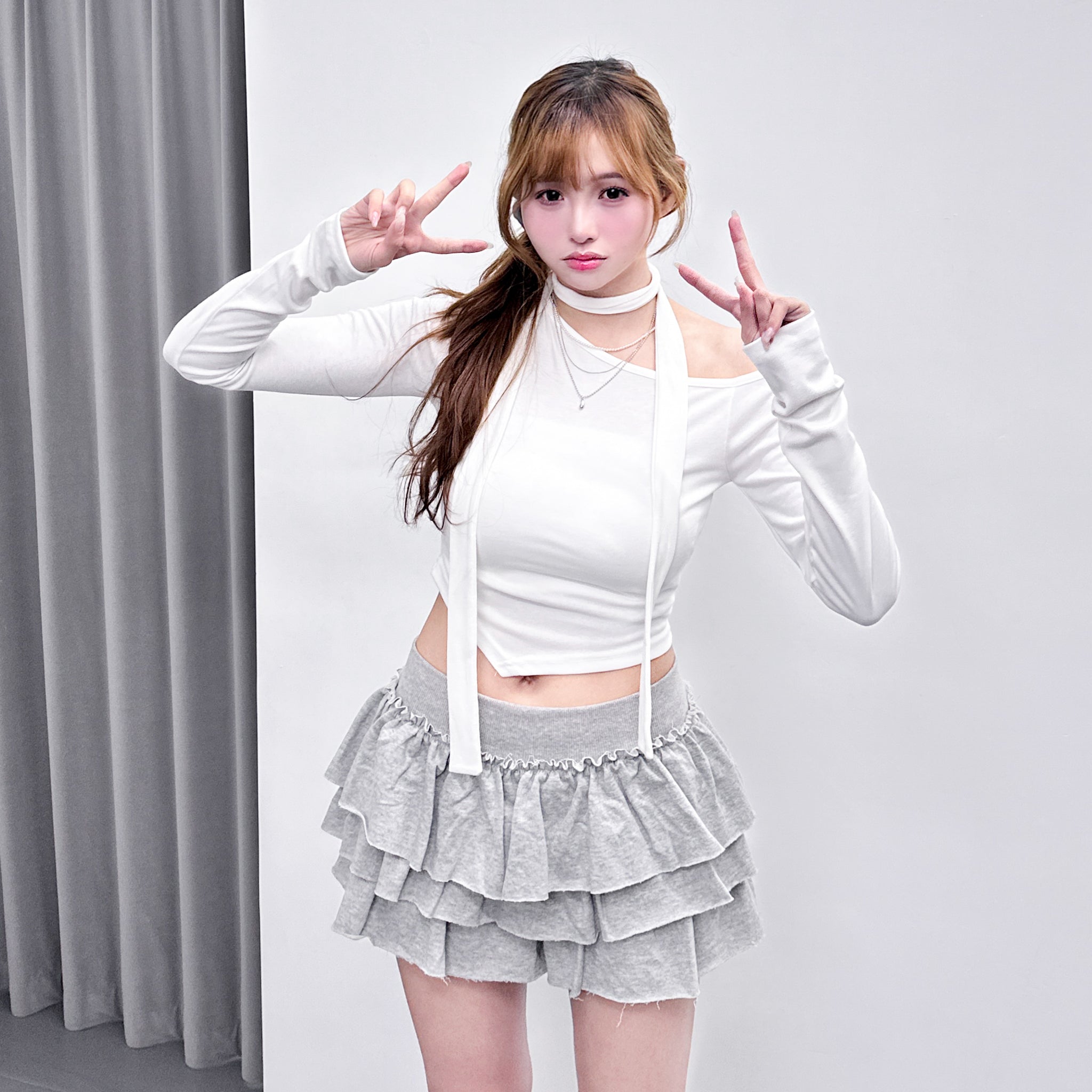 [SET] UNBALANCED ONE-OFF SHOULDER TOP WITH SCARF/ 3色